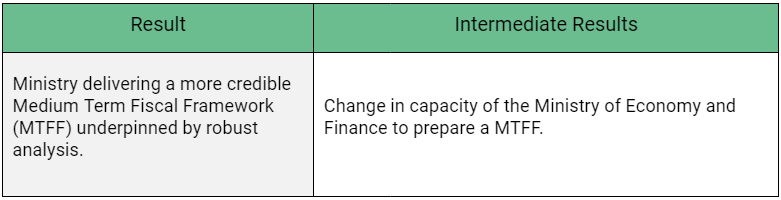 The goal of the Medium Term Fiscal Framework sub-component is to further develop the macroeconomic and fiscal framework at the Ministry of Economy and Finance (MEF) to gear economic policy making towards more inclusive growth.